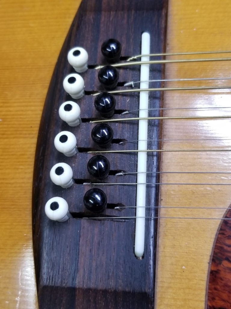 弦高調整の為にブリッジピンから弦を引き抜き、