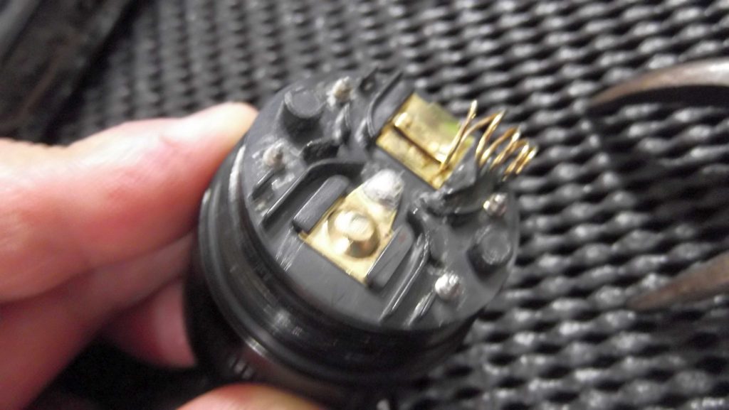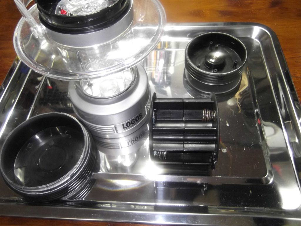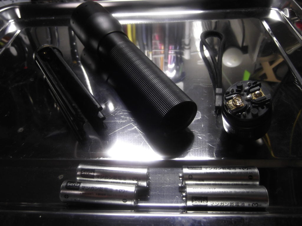 ↓作業用ledライトも内部で損傷を受けていました。導通部分が腐食する一歩手前でした。苛性ソーダを除去してマンガン電池に換装しました。